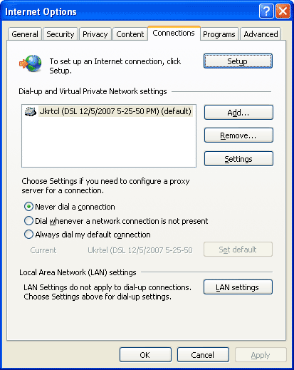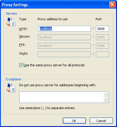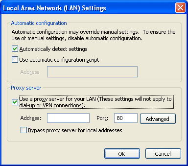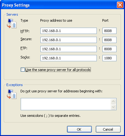 Back to Top Network Installation Guide ProxEfence as a proxy server has to be installed on the server computer, i.e., on the computer that has a connection with other computers of a network and also is connected to Internet. The server should have at least two interfaces (sometimes treat only by one interface): connection to the Internet and interface to connect with other computers of the network. Those other computers are referred to as clients. Usually clients connect to the server by a switch. To set up a proxy server you should know the IP address of the server interface through which clients are connected to the server. Please refer to the Network Installation Guide (www.softforyou.com/prx-network_guide.html) to set up a network. Downloading, Installing and Running ProxEfence You can download ProxEfence from our website: www.softforyou.com/prx-download.php Install proxy server and customize settings. By default, port 8008 have been installed for the proxy server. For example, if port 8008 is already busy at other program and you have a port for the Server computer of 4400, you should replace “server.sap = 0.0.0.0:8008” with “server.sap = 0.0.0.0:4400” in the file "…/Program Files/SoftForYou/ProxEfence/cfg/HTTP.cfg". Do not change the 8008 port, if no program previously installed on the computer uses this port. If you are using a Personal Firewall on Server, you should configure your firewall not to block ProxEfence modules. For example, Windows XP with Service Pack 2 contains a built-in firewall, and if it is turned on then you should add ProxEfence modules: PefService.exe, ProxEfenceW.exe located in the "…/Program Files/SoftForYou/ProxEfence" directory, into the Exceptions list of this firewall. We recommend that you disable all your personal firewalls (including built-in Windows XP firewall) temporarily to make sure that the proxy server is working properly. Note: Proxy server must be restarted if any change in the configuration file has been made (Click 'Restart Proxy' in ProxEfence menu). Note: To find a free port, you need to check which ports are used. You should use the netstat -an command to see the ports that are being used on your computer. Please make sure that the port that you want to use is not listed in the netstat -an output. For example, if you want to use port 8008, please make sure that there is no string like "*.*.*.*:8008" (where *.*.*.* is any IP address) in the netstat -an output. To do this, please follow through these steps: - Click Start, click Run, type cmd, and then click OK. - At the command prompt, type the following, and then press ENTER: netstat -an - to write the netstat -an output to the port.txt file, type: netstat -an > port.txt Run proxy server. After starting the program the icon-logo of ProxEfence will appear in the right bottom corner of the monitor - in the system tray. You should right-click on this icon to open the menu that contains the following items: - Testing Program - to open the ProxEfence Testing Program manual in a new window. - Getting Started - to open the ProxEfence Getting Started manual in a new window. - ----------- - Restart Proxy - Setting up Filtration - to open http://setup.pef - Registration - About - ----------- - Exit - stop the proxy server and unload the program from the computer Back to Top How to set up Web Browsers Web Browsers of all computers in the network should have access to the Internet through the ProxEfence proxy server. Setting up Internet Explorer Push the “Tools” button, then select “Internet Options”, select “Connections” tab. When connected to the Internet by dial-up or Virtual Private Network (VPN), push the “Settings…” button, check the ‘Use a proxy server for this connection’ checkbox. You should enter the IP address of the proxy server in the "Address" field. Use "localhost" as the IP address for your Server computer. If your Server is connected to a local network, you can use the IP address of your Server instead of "localhost". Use your Server computer's IP address as the IP address for Client computers. Use 8008 as a port number if you did not change the port before. When connected to the Internet by cable or wireless, press the “LAN settings” button and enter the IP address and port as for “Settings…”. Example to configure web proxy settings in IE. Proxy server address: 192.168.0.1 Push the “Tools” button, then select “Internet Options”, select “Connections” tab. ![]() Click the "LAN Settings" button. Configure as it is shown below. ![]() Click the "Advanced" button. Configure Clients as it is shown below. ![]() - or - Click the "Advanced" button. Configure Server as it is shown below. ![]() Back to Top Settings for Mozilla FireFox Press the “Tool” button, then select “Options...”, select the ”Advanced” tab, press the Settings…” button and select the “Manual proxy configurations:” button. You should enter the IP address of the proxy server into the fields. Use "localhost" as the IP address for your Server computer. Use your Server computer's IP address as the IP address for Client computers. Enter “8008” into the field “Port”, if the number has not been changed before. Check the “Use this proxy server for all protocols” checkbox. Finally, press OK. Back to Top Settings for Opera Press the “Tools” button, then select “Preferences…”, select the “Advanced” checkbox, then select “Network” on the left side, press the “Proxy server” button. Turn on ‘HTTP’, “HTTPS’, ‘FTP’ checkboxes. You should enter the IP address of the proxy server into the fields. Use "localhost" as the IP address for your Server computer. Use your Server computer's IP address as the IP address for Client computers. Enter “8008” into the “Port” field, if the number has not been changed before. Check the “Enable HTTP 1.1 for proxy” checkbox, and finally press OK. Back to Top Settings for e-mail cl